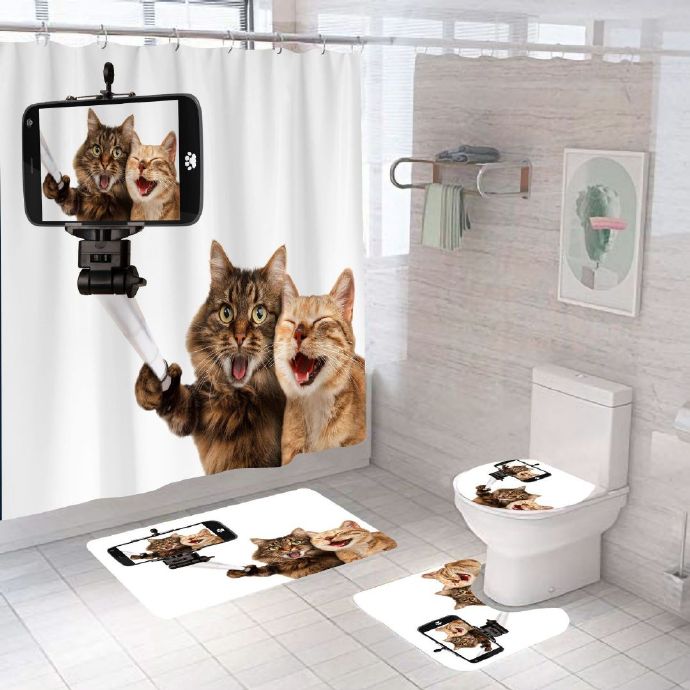 4 Pcs Funny Shower Curtain Sets With Non Slip Yellow And White Toilet Lid Bath Mat Rugs Cats Takes A Selfie With A Selfie Stickand 12 Hooks Bath Decor Shower Curtains 72 X 72